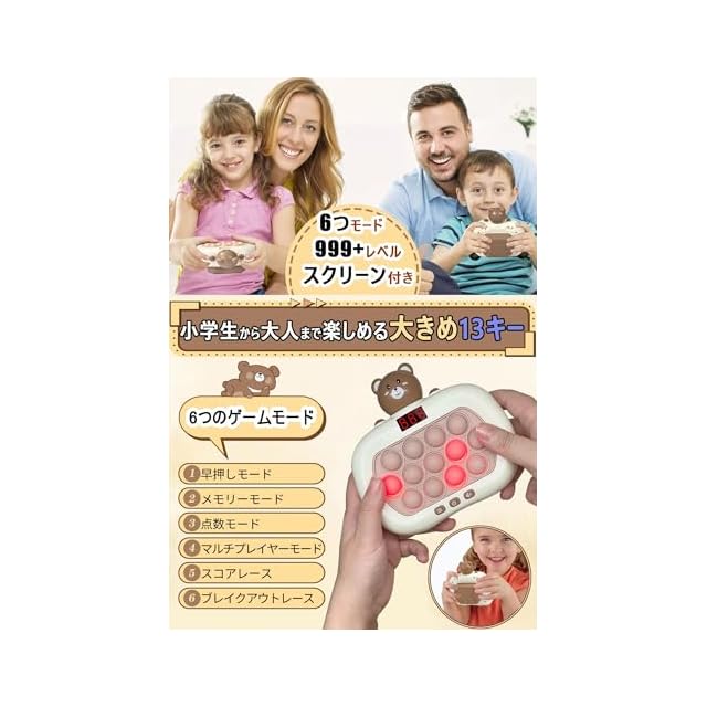 【最新plus13キー スクリーン付プッシュポップ ゲーム】6つのゲームモード、999+レベル、スクリーン付き。このおもちゃには、「ブレイクアウトモード」、「メモリーモード」、「スコアモード」、「マルチプレイヤーモード」の4つのモードをベースに、「スコアレース」「ブレイクアウトレース」の2種類の時間制限付き対決ゲームモードが追加され、ゲームの交流性がより際立ち、より刺激的になりました。各モードには異なる難易度が設定されており、子供たちは難しいレベルから達成感を得ることができます。