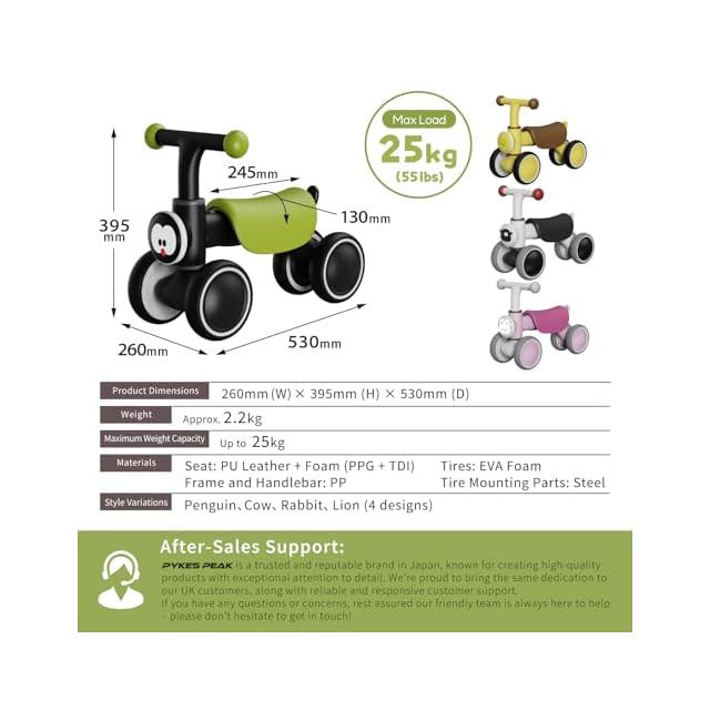お子様が一人で遊ぶのは危険ですので、保護者同伴の上でご使用ください✅【仕様 / 内容】【仕様】サイズ:530×260×395mm、重量:2.2kg、最大積載量:25kg、適用年齢:1歳以上、椅子の高さ:約27㎝ 素材:サドル(PUレザー+フォーム)、タイヤ(EVA)、本体とハンドル(PP)、タイヤ連結部(スチール)【メーカー】PYKES PEAK製品の販売元は日本です。カスタマー対応も日本人スタッフが日本語で丁寧に対応いたします。初期不良や故障などの場合は、公式ライン「@pykespeak」もしくは、メール「[email protected]」までご気軽にご連絡ください。