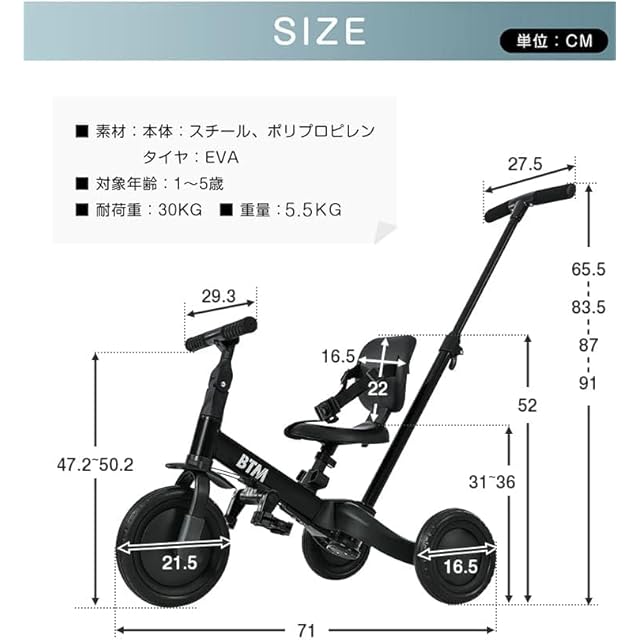 【安全性が高い!】①こどもがハンドルを急旋回させ、曲がりすぎることを防ぐため回転角度を制限し、より安全性を高めました。②赤ちゃんの安全をより効果的な保護できます。 お子様の体型に合わせて、高さ25cm調整できるサドルとハンドルは4段階を調整できます。③三輪車の後部に付いているコントロールバーには進む方向を操作できる舵切り機能付き!