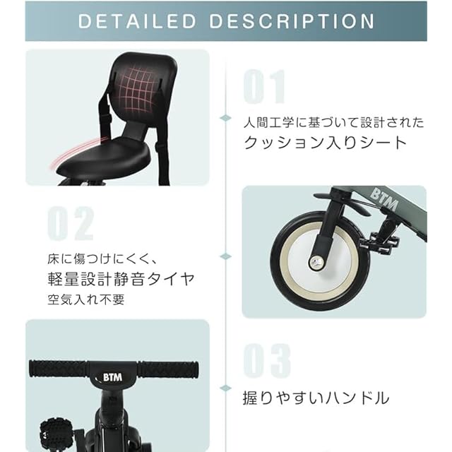 【安心な車輪デザイン】三輪車に乗っているときは、意外と足の巻き込みによるケガが多いのが現状。子どもの小さな足は回転する車輪に巻き込まれやすく、ケガの危険度が高まります。自転車のような金属製の車輪は足を巻き込みやすいので、車輪部分が平らに覆われているディスクタイヤを選ぶと安心です。優れた耐衝撃性を発揮する高品質チタンエアタイヤは、耐摩耗性も良く、あらゆる路面にスムーズに対応することができます。タイヤは空気不要で室内でも床を傷つけにくい素材です。
