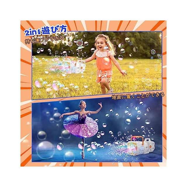 【2in1遊び方】このバブルガンには、2つの遊び方があります。まず、専用のハンドルを使って持って遊ぶことができます。この方法は、手軽にバブルを吹いたり、友達と一緒に遊んだりするのに最適です。 また、もう一つの遊び方は、バブルガンを地面に直接置くことができます。この方法を使うと、大量のバブルを一気に作り出すことが可能で、パーティーやイベントなどの場で非常に効果的です。