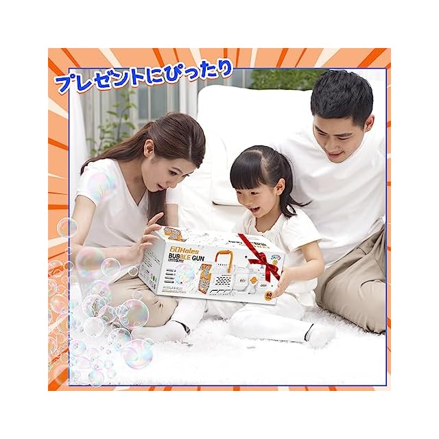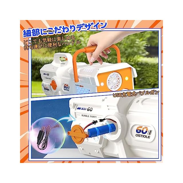 【セット内容】橙バブルガン*1、リチウムイオンバッテリー*1、USBケーブル、ドライバー、シャボン玉液ボトル*2(ご注意:市販のシャボン玉液をご利用ください)