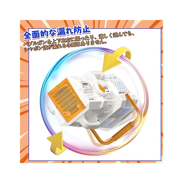 【360度液漏れ防止】このバブルガンは、泡液が漏れるのを防止するための360度防漏デザインが施されています。このデザインにより、泡液が漏れる心配がなく、子供たちは安心して遊ぶことができます。また、泡液が無駄にならず、長時間の遊びにも耐えることができます。