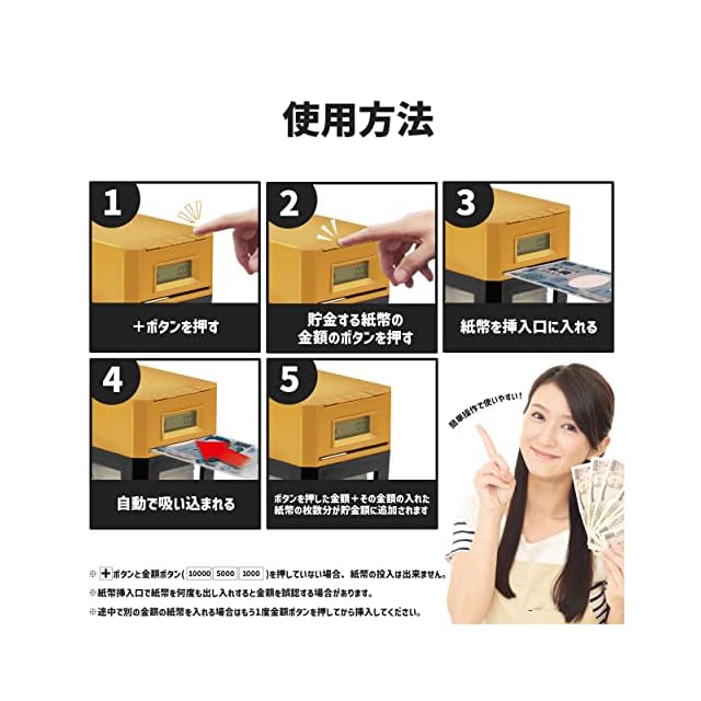 ●金額は1000円単位でカウントされます。99,999,000円までカウントが可能です。 ●硬貨の挿入できません。 ●紙幣の投入を挿入口付近でやめた場合も、紙幣がモーターまで届いていたら金額が追加されます。 ●紙幣が折れ曲がっている場合はできる限りまっすぐに伸ばしてから投入してください。 ●電池を抜いても一定時間は金額を記憶していますが、電池交換は速やかに行ってください。 ●紙幣を2枚以上重ねて入れないでください。途中で詰まり、モーターが壊れる可能性があります。
