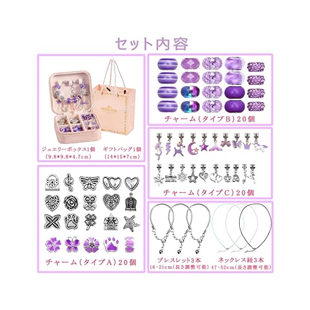 【セット内容】60個様々なかわいいチャームがセットになっている、また基本的なブレスレット3本、ネックレス紐3本が付属、女の子が喜ぶようなアクセサリーが簡単に作れる!おしゃれを持ち始めた子どもに向けています。6歳以上