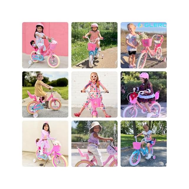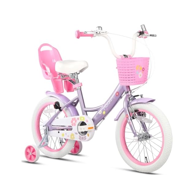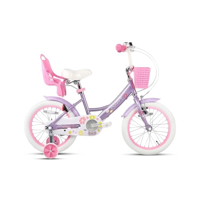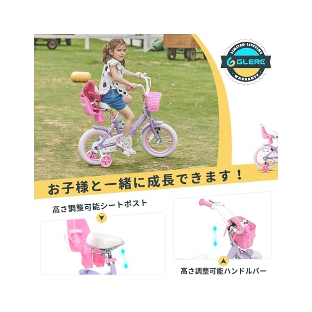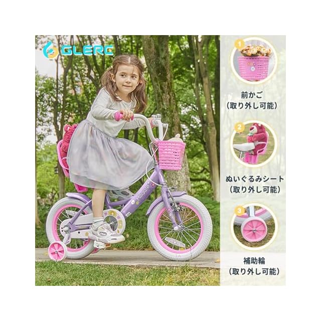 Glerc Maggie 子供用自転車 女の子用 キッズバイク 幼児乗り練習 花柄 かご付き 補助輪付き こども三輪 ぬいぐるみ座席付き vブレーキ 3~5歳 14インチ ピンク&パープル | つむぎ屋