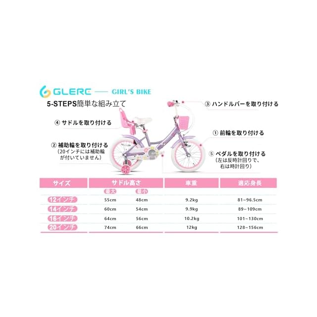 【ハンドルとサドル高さ調整可能】適応身長:12インチ:81cm~96cm、14インチ:89cm~109cm、16インチ:101cm~130cm、20インチ:128cm~156cm。【12/14/16インチ補助輪付き】取り外し可能な補助輪付き、自転車乗りに上達したら、補助輪を外してOKです。16インチと20インチはキックスタンド付き