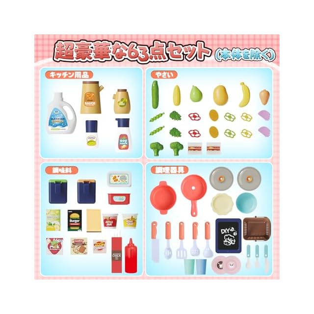 【豪華な64点セット】大きな台所本体、野菜、果物、調味料、キッチン用具、調理器具などバリエーション豊な64点セットで、お子様一人でも 、お友達や家族と一緒に楽しく遊びます。