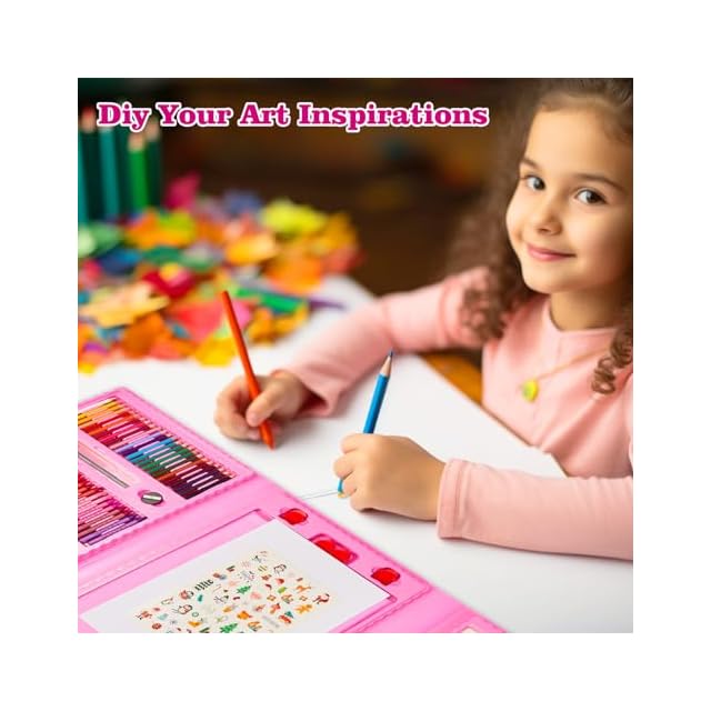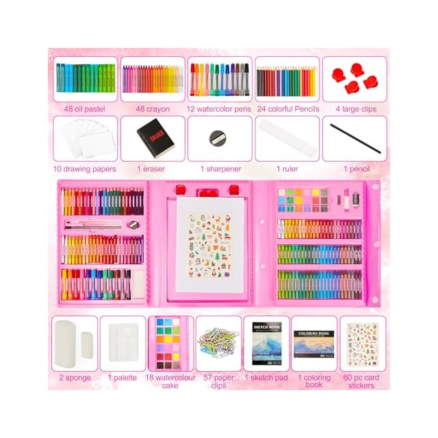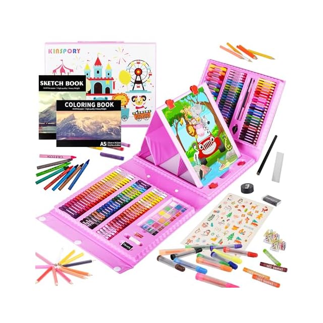 KINSPORY 290点 お絵描きセット 子供用 アートセット、両面イーゼル 水彩画 色鉛筆 絵の具 マーカー クレヨン セット、新進アーティスト向けの 学用品 画材 ケースギフトガールズボーイズキッズティーンズ 子供2人遊び用 (ピンク) | つむぎ屋
