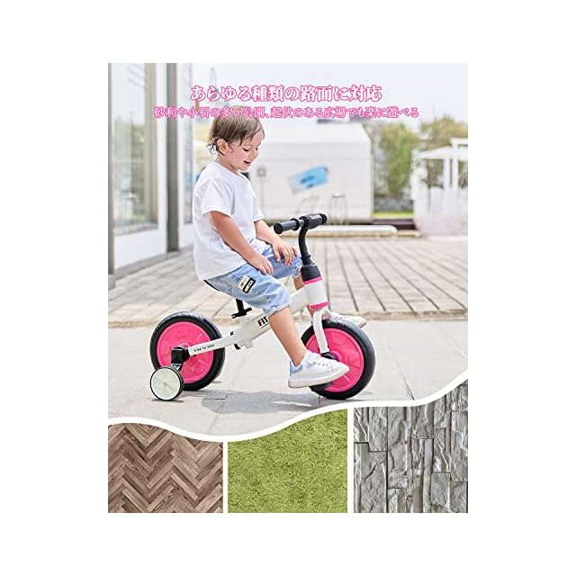 「様々な路面に対応」様々なシーンに適用できます。雨の日や夜でも、安心して家の中を動き回ることが可能。安定感のある幅広タイヤで、砂利や小石の多い公園、起伏のある広場でも、お尻が痛くなくて、思いっきり遊んでいただけます。