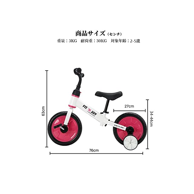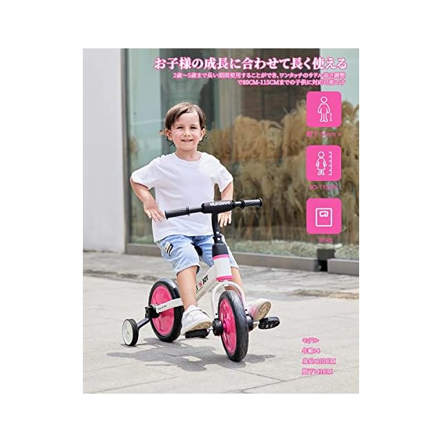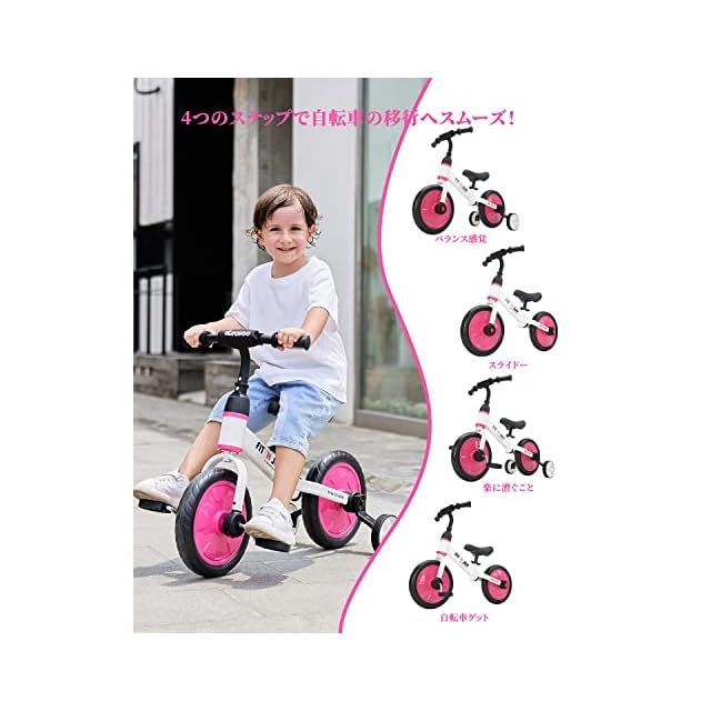 「成長に合わせる4つのステップ!」本キッズバイクの特徴が自転車に非常に近いので、自転車に乗るために必要なバランス感覚を身につけることができます。バランス感覚が身につく(ペダルなし、補助輪付き)→スライドの練習(ペダル、補助輪なし)→楽に漕ぐこと(ペダル、補助輪付き)→自転車ゲット(ペダル付き、補助輪なし)という4ステップで自転車への移行がスムーズに行えます。