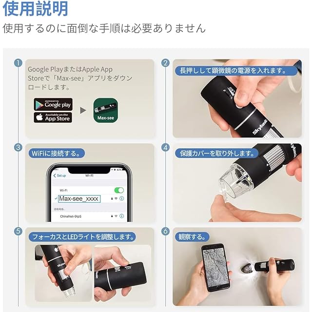 【携帯便利&操作簡単】 仕様:14.8cm*4cm デジタル顕微鏡*1 日本語説明書*1 操作ガイド説明書*1 usbケーブル*1 アプリをダウンロードして、スマホと簡単接続、フルスクリーン表示で観察が便利になります。このマイクロスコープはUSB充電式なので持ち運んでどこでもお使い頂けます。倍数調整ホイールを回転し、焦点を合わせます。固定用台座があり、簡単的に高さ、角度を決定出来ます