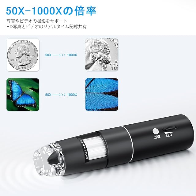 【強大な互換性】 IOS9.0 & Android6.0以降の携帯電話、コンピュータシステムのWindows vista/7/8/10、MacOS11.0に適用します。静止画&動画撮影が可能です、操作が簡単で、旅行に持っていって、子供たちが植物、鉱物、昆虫を研究したり、楽しい野外活動をしたりできます。この電子顕微鏡は、従来の顕微鏡ではなく、固定焦点の拡大鏡に近いものです。プロの真剣な生物学者には適していません