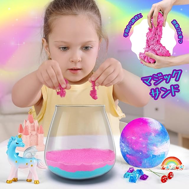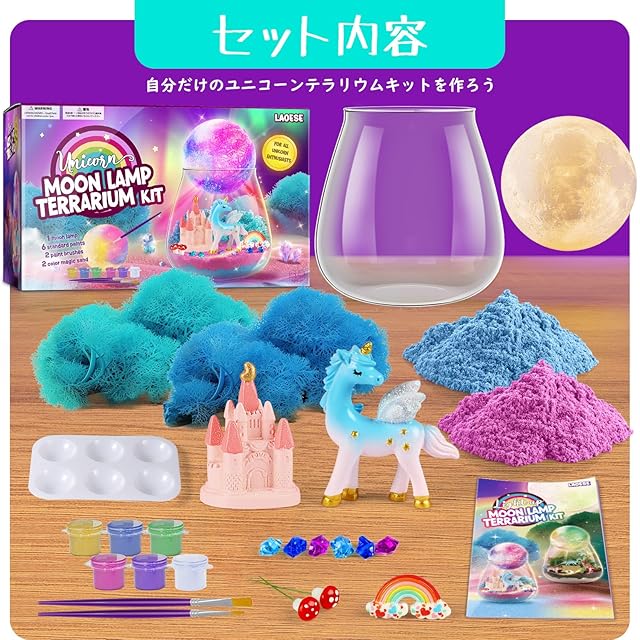 【自分だけのミニチュアキットを作ろう】このおもちゃは子供たちに向けた魅力的な工作キットで、ユニコーンテーマのミニチュアと描ける月ランプが特徴です。ユニコーンが好きな子供たちにとって、このキットは夢中になることが間違いなしです。様々なミニチュアデコパーツが提供しています、子供たちは自分が思うユニコーンファンタジーな世界が構築できます。3色のマジックサンドや苔を使って地形を作り上げ、ユニコーンの生息地を再現する楽しさも味わえます。