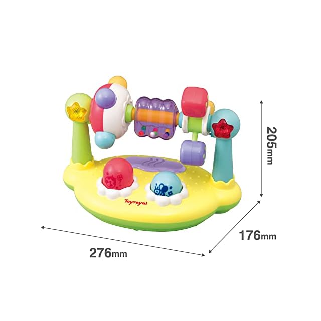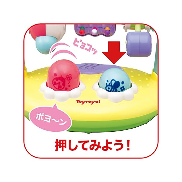 【様々なギミック付き】中央のボタンを押すとゆかいな音が流れます。ピカピカで視覚を、ゆかいなサウンドで聴覚を育みます。