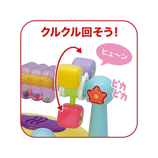 【赤ちゃんが大好きなクルクル遊び】あかちゃんが大好きなくるくる遊びができるおもちゃです。ローラーをクルクル回すとゆかいなサウンドが鳴り興味を引きます。
