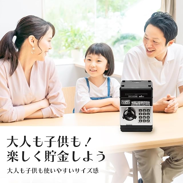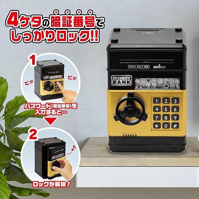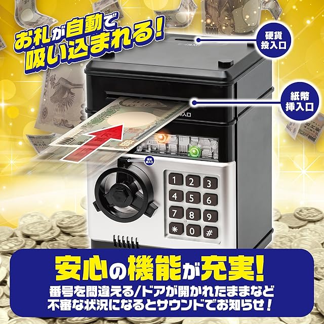 【使用方法】●紙幣挿入口に紙幣を近づけると、紙幣が自動で吸い込まれます。 ●効果は本体天面の硬貨挿入口から入れてください。 ●貯金箱を開ける際は4桁の暗証番号が必要です。初期設定は「0000」です。初めて使用される際は「0」を4回押してください。 ※暗証番号が間違っているとライトが赤く点灯し、不正解音が流れます。暗証番号が正しいとライトが緑に点灯し、正解音が流れ、ロックが解除されます。 ※暗証番号を忘れた場合は、本体から電池を抜き、初期設定の「0000」に戻してください。
