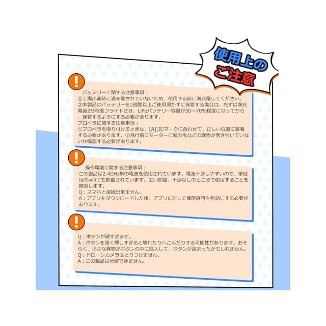 プロペラに関する注意事项: ①プロペラを取り付けるときは、【A】【B】マークに合わせて、正しい位置に装着する必要があります。 ②飛行前にモーターに髪の毛などの異物が巻き付いていないか確認する必要があります。