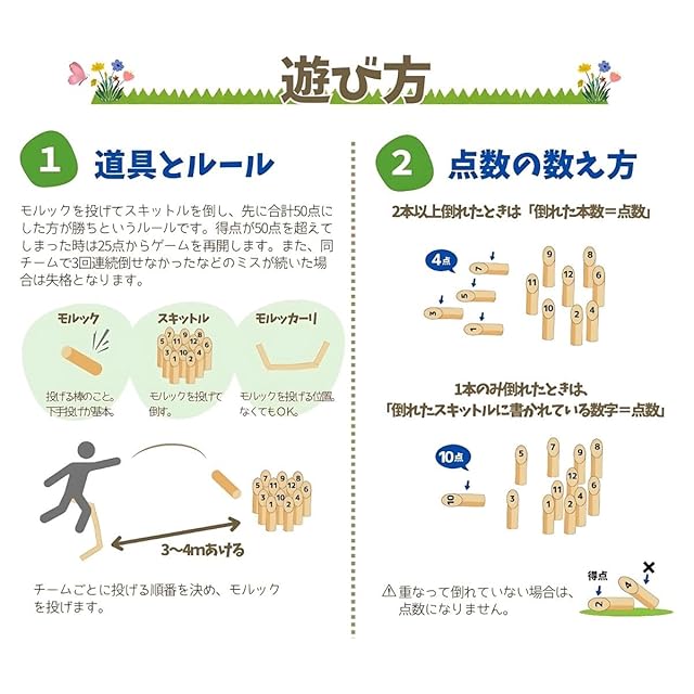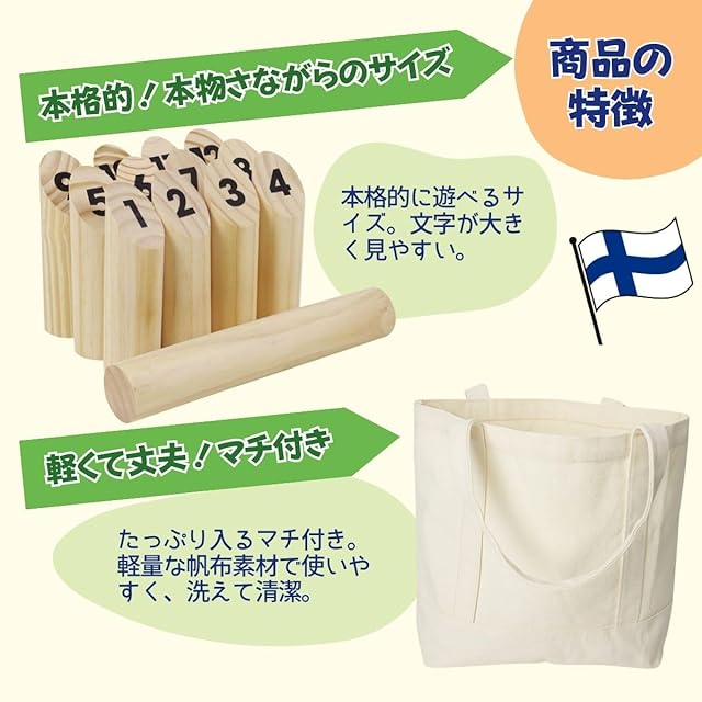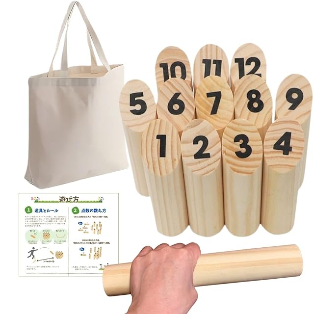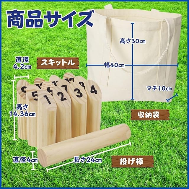 セット内容:スキットル×12、投げ棒×1、得点板×1、収納袋×1、遊び方説明書(日本語) サイズ:投げ棒 24㎝×直径4㎝ スキットル14.36㎝×直径4.2㎝(モルックの正規品とは異なりますのでご注意願います)