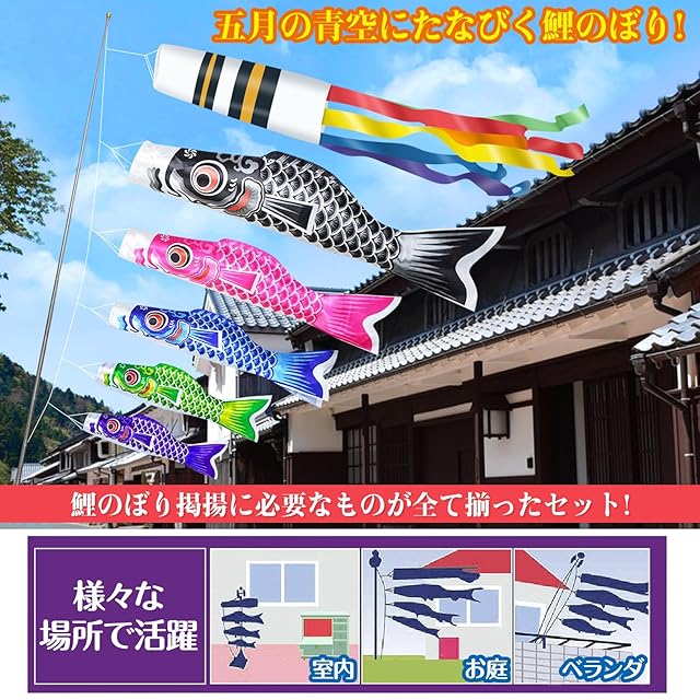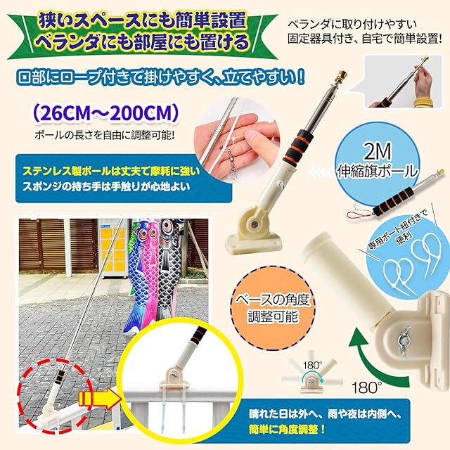 【ベランダに簡単に取り付けられる固定器具付き】鯉同士の距離は自由に調整可能です。2mの伸縮旗ポールが付属し、口部にはロープがあり、掛けやすく立てやすい設計です。ポールは最大200cmまで伸ばせ、最小26cmに縮められるので収納も便利です。また、ポールの角度は調整可能で、天気に応じて外に出したり、雨や夜には室内に向けることができます。織機で規則正しい幾何学模様を織り込むことで、泳ぐたびにキラキラ輝く豪華な仕上がりになっています。吹き流しは、伝統的な捺染ぼかし技法で染められ、春の空に映える美しい模様がバランスよく配されています。