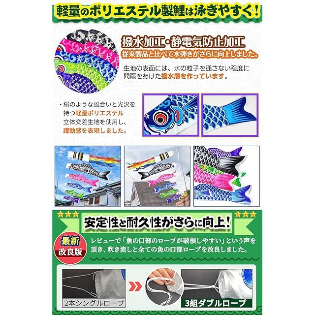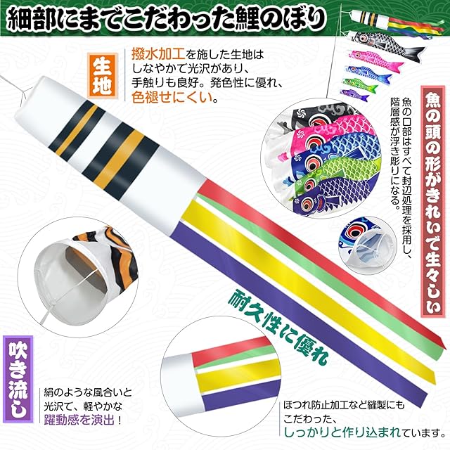 【金箔限定・最新改良版】安定性と耐久性がさらに向上!レビューで「魚の口部のロープが破損しやすい」というご指摘を受け、吹き流しとすべての魚の口部ロープを改良しました。さらに、ヒレ部分には形崩れ防止とほつれ防止加工を施し、縫製にも細部までこだわりました。従来の製品に比べて水弾きがさらに向上し、魚の口部には封辺処理を採用して、階層感が際立つように仕上げています。魚の身には細かい装飾が施され、鮮やかな色合いが魅力的です。尾の形は美しく、風にそよいで泳ぐ様子がとても印象的です。