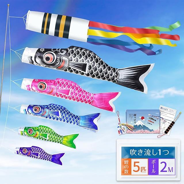 【金箔限定・最高級・鯉5匹・鯉のぼりセット】★吹き流し1.5m、金箔黒鯉1.4m、金箔赤鯉1.2m、金箔青鯉1.0m、金箔緑鯉0.8m、金箔紫鯉0.6mの5色がセットになった、標準的なファミリーセットのこいのぼりです。★セット内容は、鯉3匹、吹き流し1つ、2m伸縮旗ポール1本、取り付け金具、こいのぼり・守り袋、専用収納ケース、組み立て説明書です。★こいのぼりを設置するために必要なものはすべてセットになっているので、ベランダやお庭に簡単に設置でき、すぐに掲揚できます。守り袋も付属しており、子供たちの幸運と健康を祈ります。※矢車は付属しません。