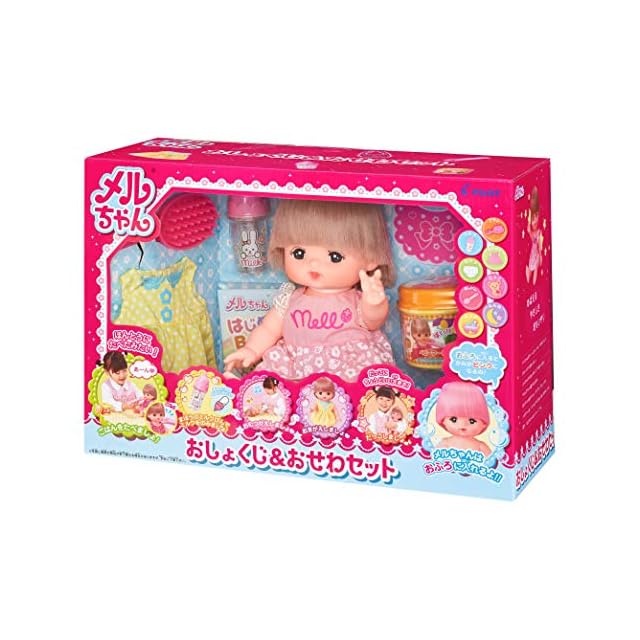 セット内容:ショートヘアメルちゃん本体(おむつ付)、ワンピース2着、ベビーフード、スプーン、ミルクびん、スタイ、ブラシ、ミニブック