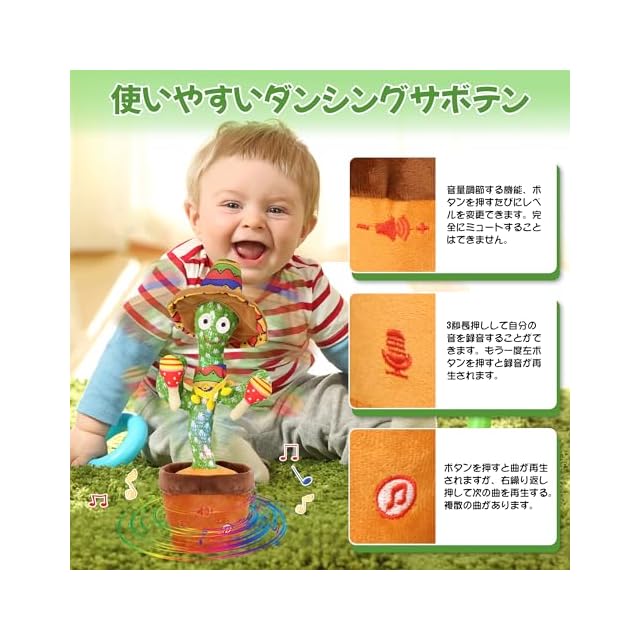 【使いやすいものまね ぬいぐるみ】 recordボタンを使って録音とオウム返しの機能があります。musicボタンには歌を歌う機能があります。電池式のサボテン 踊るサボテン おもちゃ です。(電池はパッケージに含まれていない)3本のLR6 AA1.5Vアルカリ乾電池が必要です。