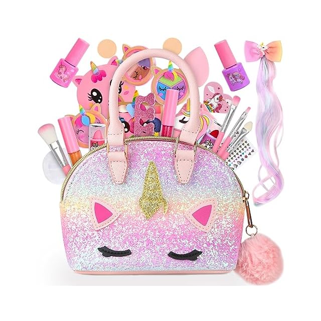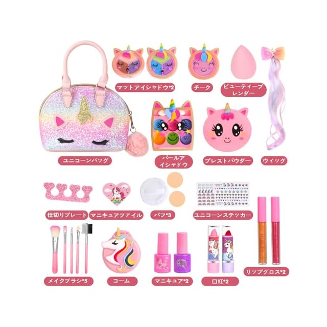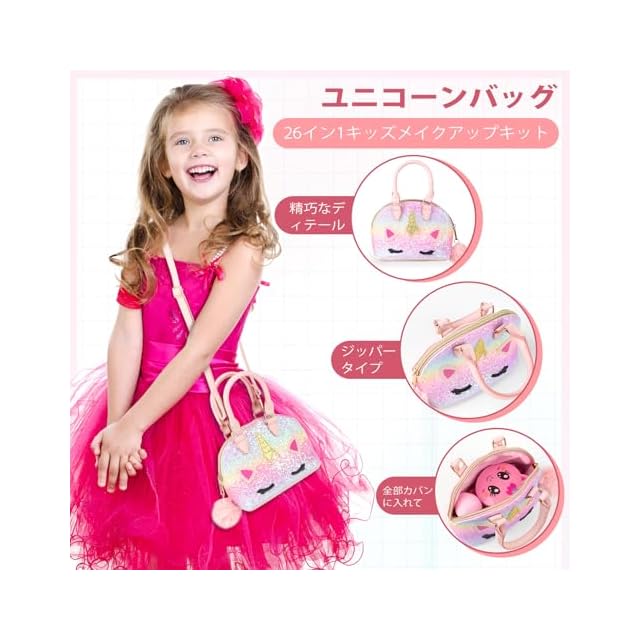 【ポータブルメイクアップキット】この子供用メイクアップセットはユニコーンの要素でデザインされており、ユニコーン子供用メイクアップセットが好きな小さな女の子に最適です。クロスボディメイクアップバッグは、外出先のメイクアップパーティーやプリンセスロールプレイゲームに必要なすべてのメイクアップアクセサリーを簡単に収納できます。
