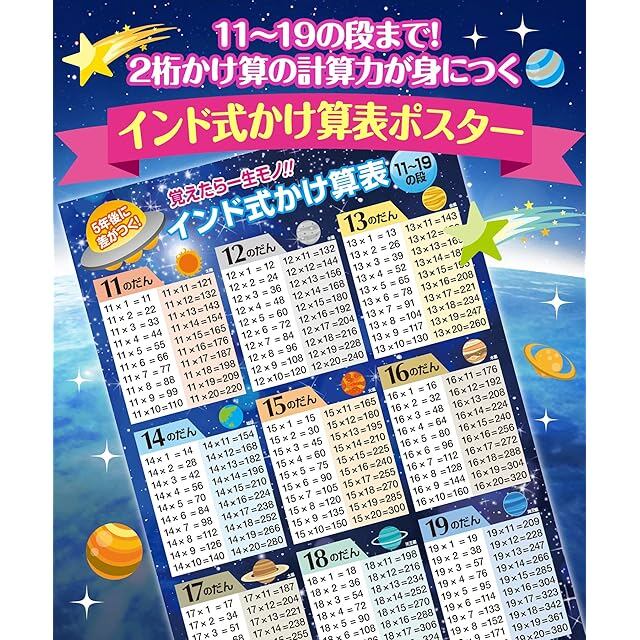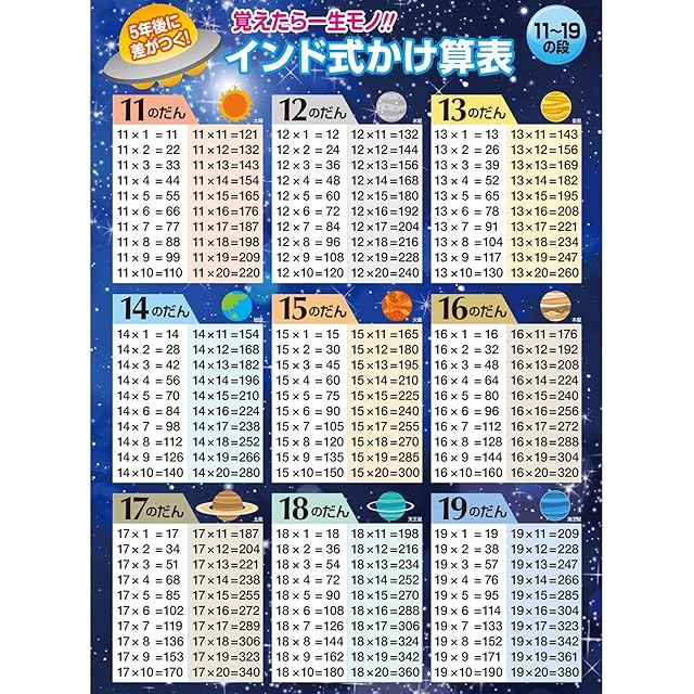 【段ごとに整理されたステップバイステップの構成】 各段ごとに11から20までのかけ算が順序立てて示されており、子供たちがステップバイステップで学習できるようになっています。視覚的な区別がつきやすい色分けや惑星のイラストが添えられており、楽しく効果的に学習できます。
