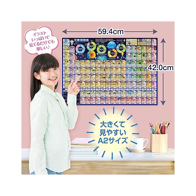 視覚的に理解しやすいデザイン:元素周期表のポスターは、各元素の情報を色鮮やかなイラストやアイコンで表現しています。視覚的に理解しやすく、見ているだけでも楽しみながら学べるデザインになっています。