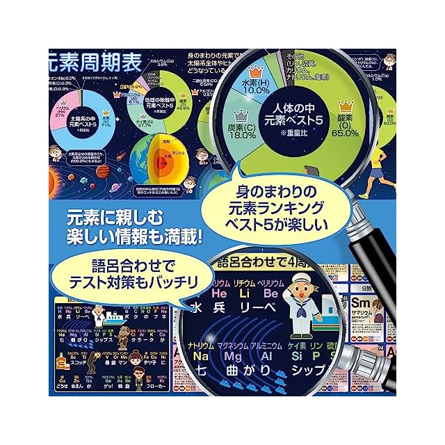 学習効果を高める構成:ポスターは、単に元素を羅列するだけでなく、関連する豆知識や面白い事実も記載されており、学習効果を高めるための工夫が随所に見られます。また、語呂合わせなどの記憶術も取り入れられており、テスト対策にも効果的です。