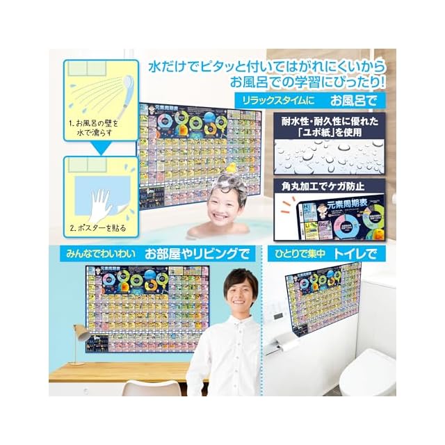 防水性と耐久性::ポスターは防水加工が施されており、お風呂場でも安心して使用できます。湿気や水滴に強く、長期間にわたって使用可能です。入浴時間を有効活用し、リラックスしながら学習できるため、勉強に対するストレスを軽減し、学習効果を高めます。日常生活に溶け込むデザインで、視覚的に楽しみながら知識を吸収できます。