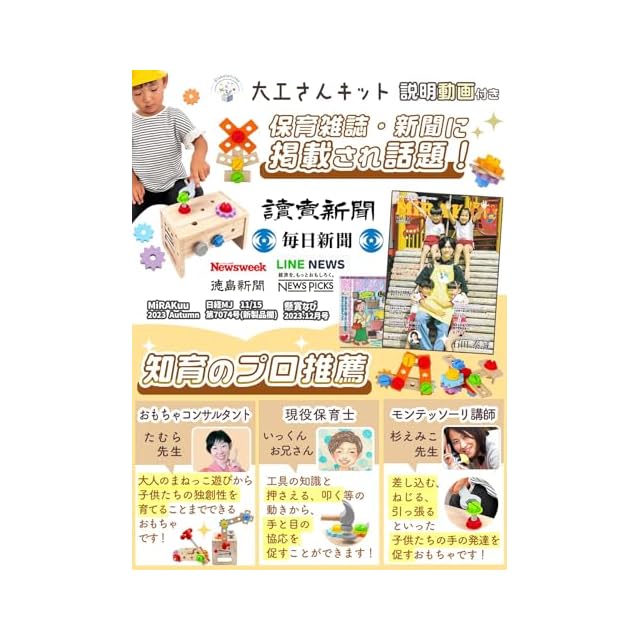 【雑誌掲載&幼稚園に導入されました!創造性が刺激される大工さんキット】おし車、バイク、お花、コマ、風車など沢山の作品を作ることができます。子供たちの発想力を生かし自由な作品を作る中で、達成感と創造力を育てることができます。