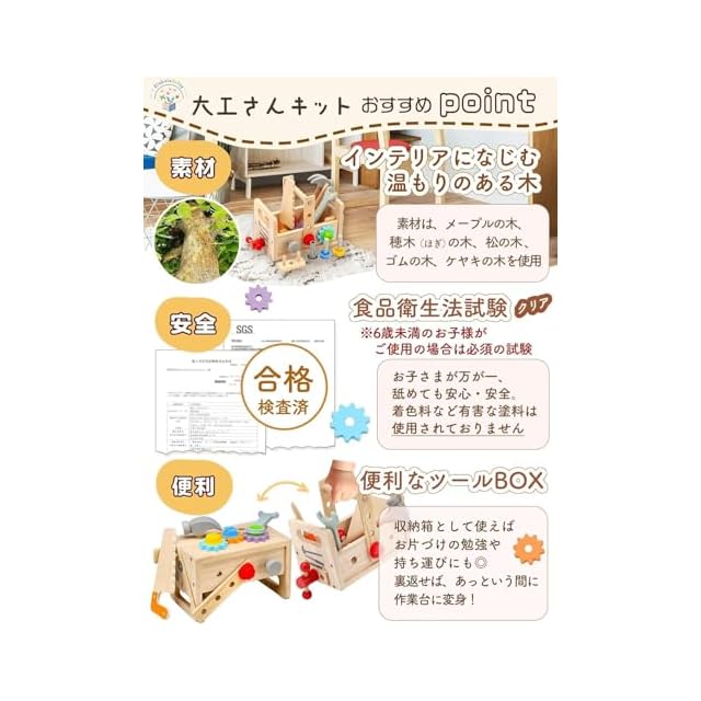 【安全性にこだわりました!】Globaledutoyの大工さんキットは厚生労働省が定める6歳未満を対象にした玩具の安全性を証明する食品衛生法試験に合格済み。ゴムの木をはじめとした天然素材で作られており、子供たちが木のぬくもりを感じながら遊ぶことができます。 木面は滑らかに研磨されています。