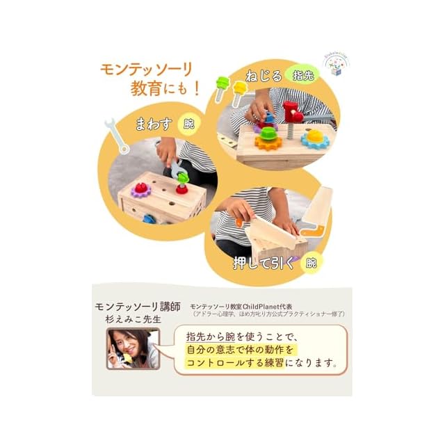 【モンテッソーリ講師&おもちゃコンサルタント&人気保育士推薦】大工さんキットでは日常生活では行わない動作を実践します。”差し込む、ねじる、ひねる、たたく”という動作は指から腕までの子供が自分の体をコントロールする練習に最適です。
