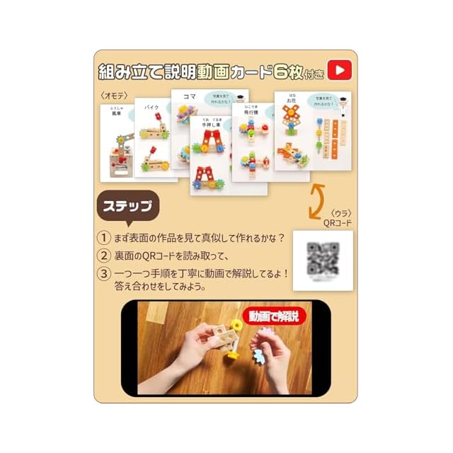 【大工さんキット同梱物】工具6種類(トンカチ、ドライバー、スパナ、のこぎり、ねじ棒、歯車) 組み立て部品18点(木8点、ねじ5点、ナット2点、歯車3点)が同梱。 ツールボックスは収納箱にも!5枚のカードには組み立て解説動画へ飛べるQRコードがあります(紙やすり付属)。※パッケージは予告なく変更となることがございます。