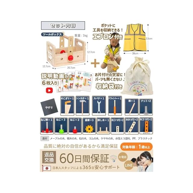 大工さんキット モンテッソーリ 玩具【知育のプロ推薦】組み立て 知育玩具【手指の発達促進】【食品衛生法試験合格】男の子 女の子 3 4 5 6歳誕生日 プレゼント 工具 大工 おもちゃさんセット 木のおもちゃ 車 収納ボックス付き (工事用ベスト付き) | つむぎ屋