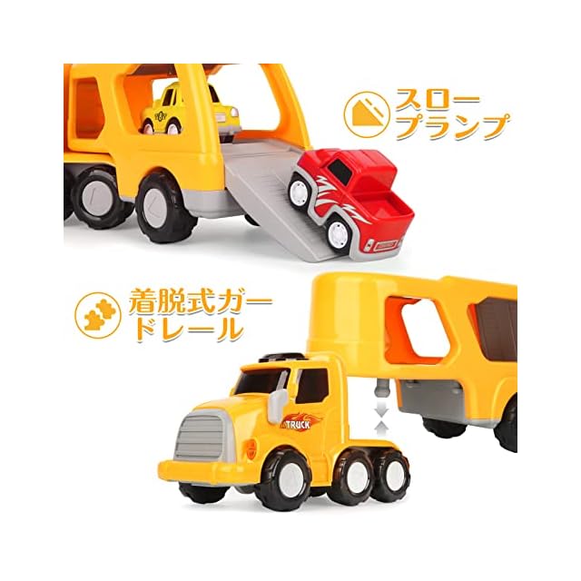 3歳 おもちゃ 男の子:大きな幼児用輸送トラックの車 おもちゃを前方に押すと、4台のミニカーでスムーズに発進します。また、すべての男の子用小型トンカトラックには摩擦力があり、後ろに引いて離すだけです。スロープランプとトランクは調整可能で、より楽しみを追加します。