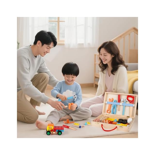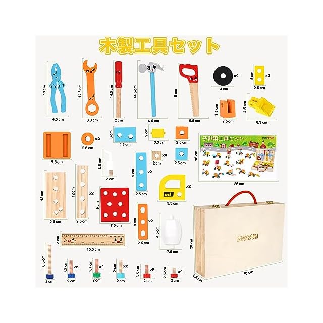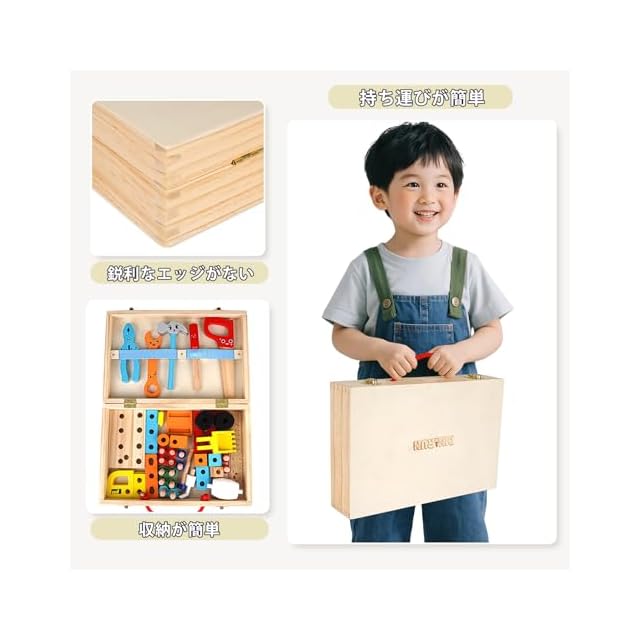 安全な木のおもちゃ: この子供用工具箱の付属品は、鋭利なエッジやとがった部分のない高品質の木材で作られており、子供たちが安全に遊ぶことができます。 子供の収納力を向上させる木製ケースが付属しています。子供おもちゃ人気 モンテッソーリ 玩具。