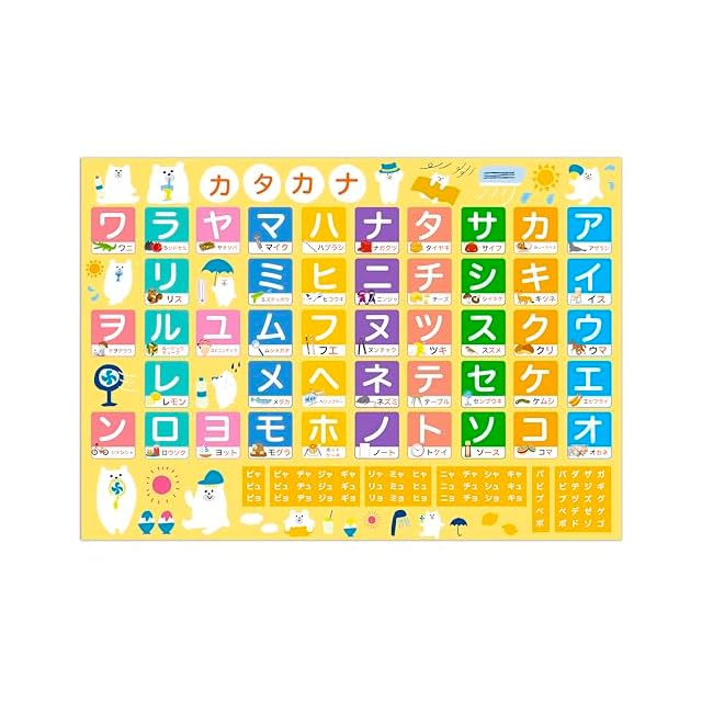 「多種多様な文字、イラスト」ひらがな・カタカナ・濁点・半濁点・単語・イラストも描かれていて、イラストからお子様が興味を持って覚えていただけるようにしました。