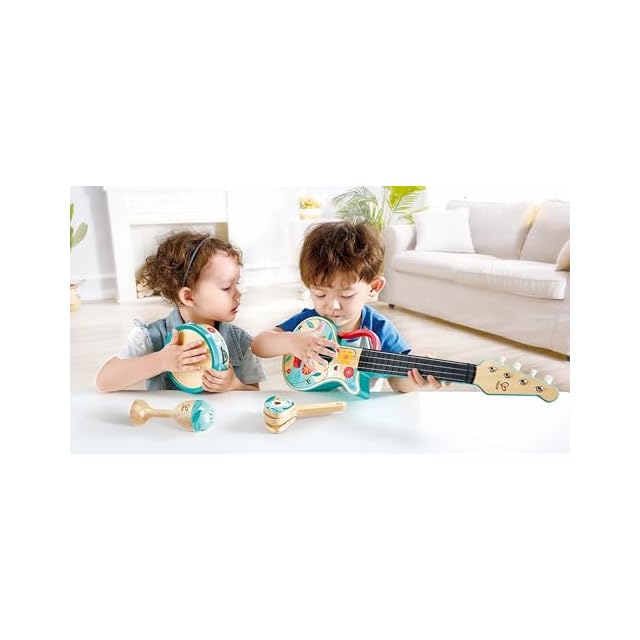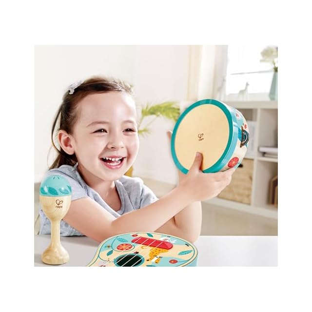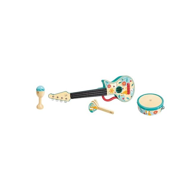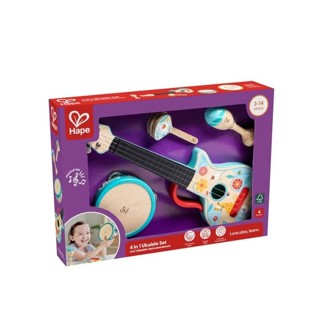 ウクレレやマラカス、タンバリン、カスタネットと4つの本格的な楽器が楽しめる楽器セットです。<br>ウクレレはヘッドについているペグを回すことで音程を調節することが可能です。楽器ごとに異なる音色が楽しめ、音遊びが盛り上がること間違いなしです。