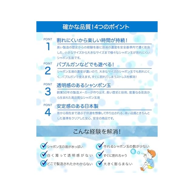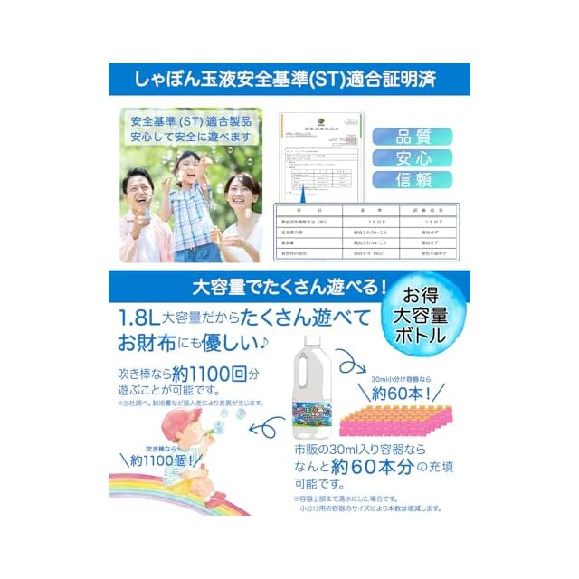 【✅シャボン玉液安全基準適合証明済】信頼の日本製商品です。また安心のシャボン玉液安全基準適合証明済(STマーク)となっております。