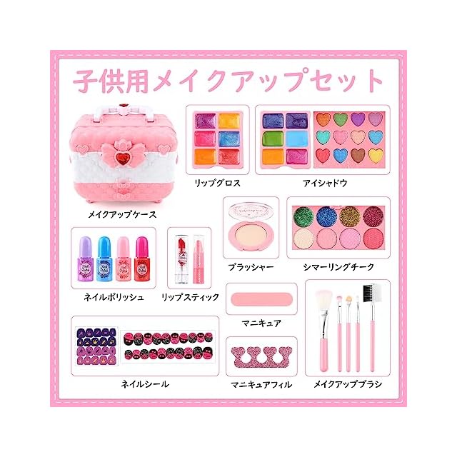 メイクセット 女の子:このメイクセット女の子 おもちゃには、メイクとネイルに必要なものがほとんどすべて入っています。マットアイシャドウ、グリッターアイシャドウ、チーク、マニキュア、リップスティック、パウダー、メイクスポンジ、爪やすり、フィンガーセパレーター、メイクブラシ、鏡付きメイクケースが含まれています。