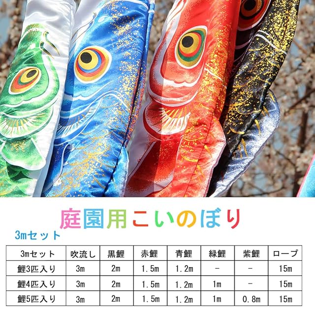 【鯉のぼり鯉4匹 セットの内容】五色吹流し3m・黒鯉2m・赤鯉1.5m・青鯉1.2m・緑鯉1m・ロープ15m。