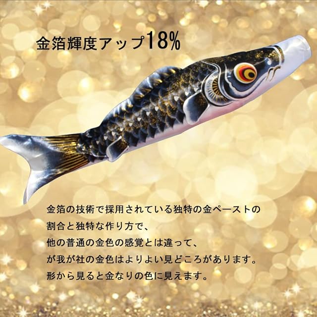 【大型 最高級鯉のぼり】最高のナイロン生地を使用し、一際映える鮮やかな黄金の鯉が豪華な逸品。一番の丈夫な布地を作って、雨・風に強く、軽く色鮮やかに泳ぎます。撥水加工処理仕上げ生地を使用し、従来の製品に比べて良くなりました。