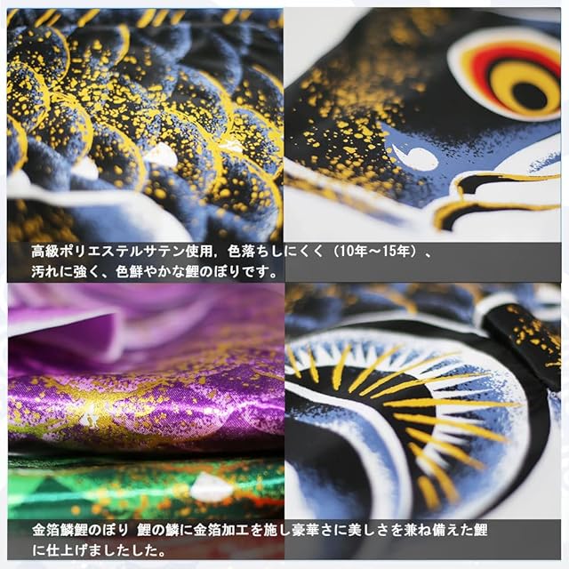 【細部にまでこだわって作った鯉のぼり】力強く泳ぐ和鯉をイメージして制作しました。重ねて何度も染める ことで深い色合いを作り、金箔を全体に散らして水しぶきを表現 しました。 見栄え、質感共に細部にまでこだわって作った鯉のぼりです。