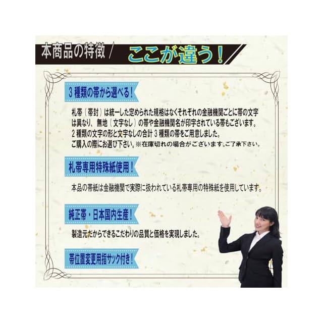 札帯(帯封)は統一した定められた規格はなく、金融機関ごとに帯の文字は異なり、無地(文字なし) の帯や金融機関名入りの帯もございます。文字なし帯取り付け済み。