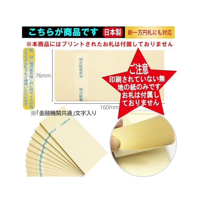 札帯(帯封)は統一した定められた規格はなく、金融機関ごとに帯の文字は異なり、無地(文字なし) の帯や金融機関名入りの帯もございます。「金融機関共通」太字文字入り、帯取り付け済み。