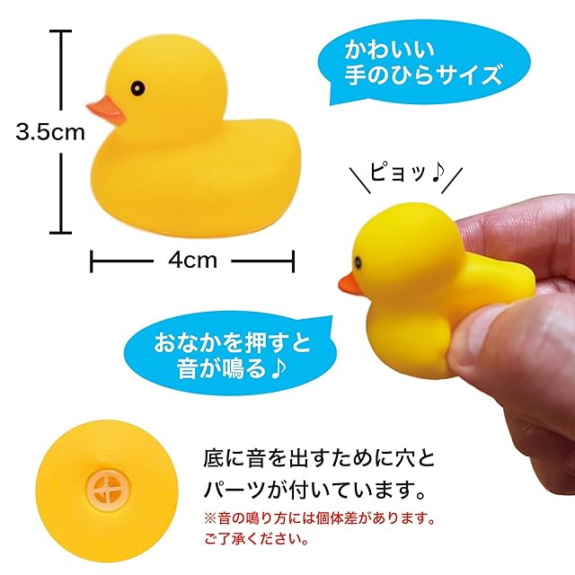 【内容量】100個 【材質】本体:PVC 底部分の音が出るパーツ:ポリエチレン 目・クチバシ:水性アクリル樹脂塗膜